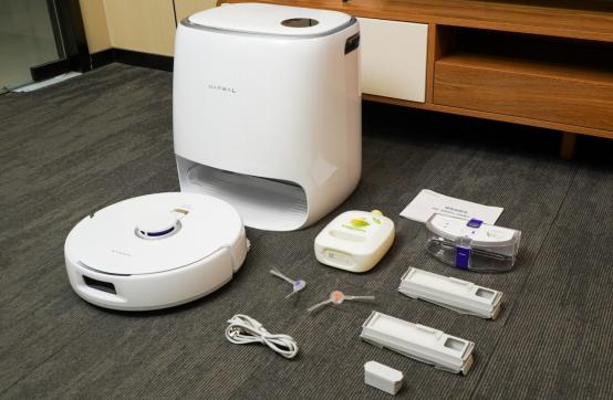 先从外观说起,能够正常的看到这次J4在包装上面做了不少优化,使得整体的体积减少不少,快递上门的时候,消费者搬起来也挺轻松。打开外包装箱后,除了机器人以及基站的主机部件外,还配备了边刷、基站电源线、除菌清洁剂、银离子除菌模块、一次性尘袋以及尘盒等配件。
