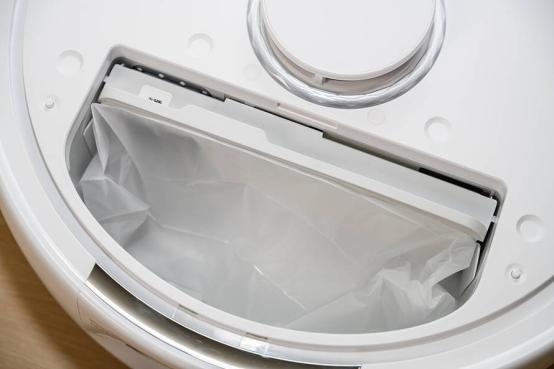 3、 尘袋虽然不是很大,但是好在有毛发压缩技术的加持,机器人每次清洁完成后回到基站都会对尘袋内部垃圾进行压缩,已达到最大的利用空间。