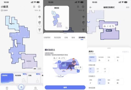 在易用性方面,云鲸J4也迎来了升级。这代J4的鲸灵托管模式再次升级2.0,除了保留了1.0的基本功能:先扫后拖、先拖后扫、同时进行外,还增加了自定义模式。可以自定义不同房间的清洁配置,比如扫拖的次数,扫地吸力的大小,拖地的干湿程度。